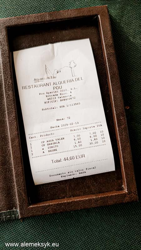 Nasze kubki smakowe oszalały na punkcie obłędnej czarnej paelli z owocami morza, wzbogaconej o sepię z kałamarnicy – uczta, która zachwyca zarówno smakiem, jak i estetyką podania. Idealnym dopełnieniem tej paelli były orzeźwiająca Aigua de Valencia i tradycyjna Sangria, które sprawiły, że każdy łyk był prawdziwą eksplozją smaków. Mimo że Alqueria del Pou to lokal ogromny z dużą przestrzenią i ilością miejsc, to w sezonie warto zarezerwować stolik z wyprzedzeniem, gdyż miejsce to cieszy się sporym zainteresowaniem!