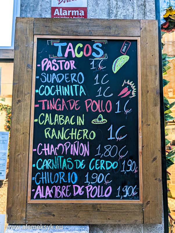 Tacos serwowane są w różnych wariantach, a cena – zaledwie 1 euro za sztukę – sprawia, że można eksperymentować i tworzyć własne kombinacje smakowe. Ta mała perełka w sercu Walencji to dowód na to, że autentyczne meksykańskie smaki mogą współistnieć z hiszpańską gościnnością 🙂