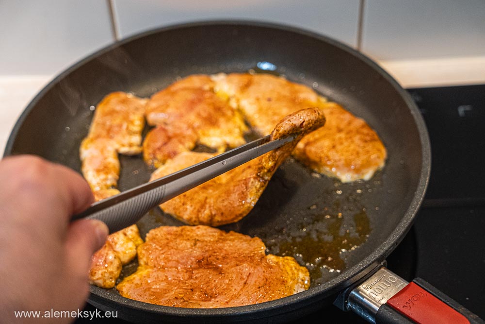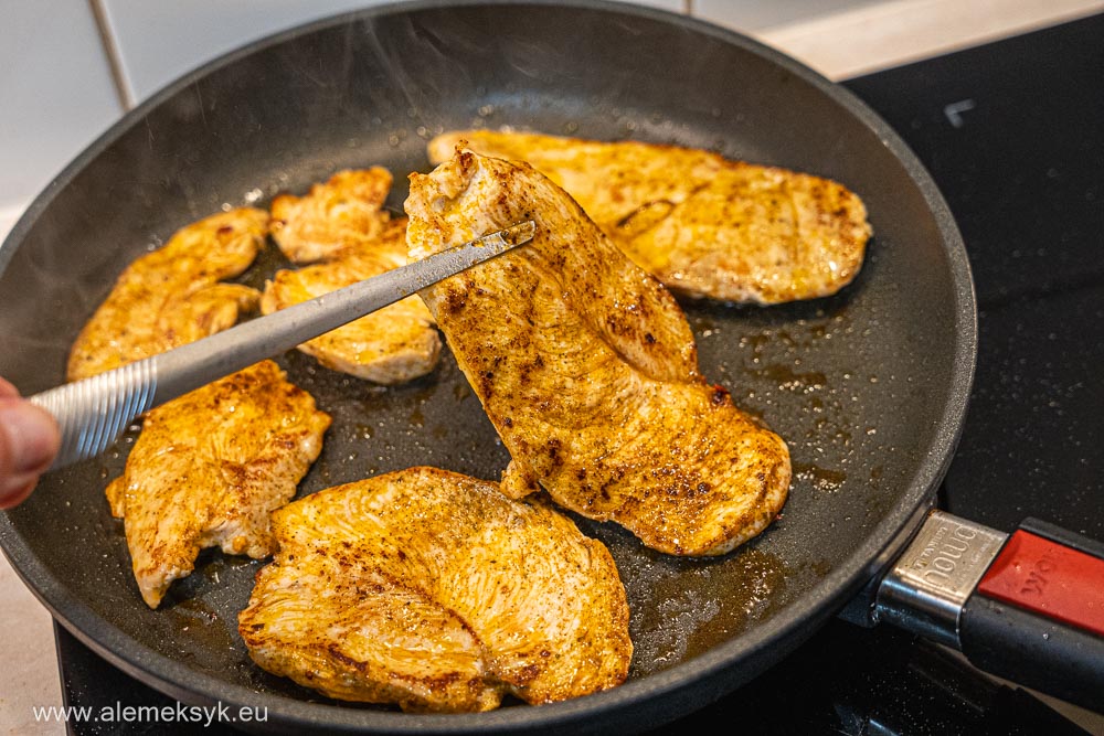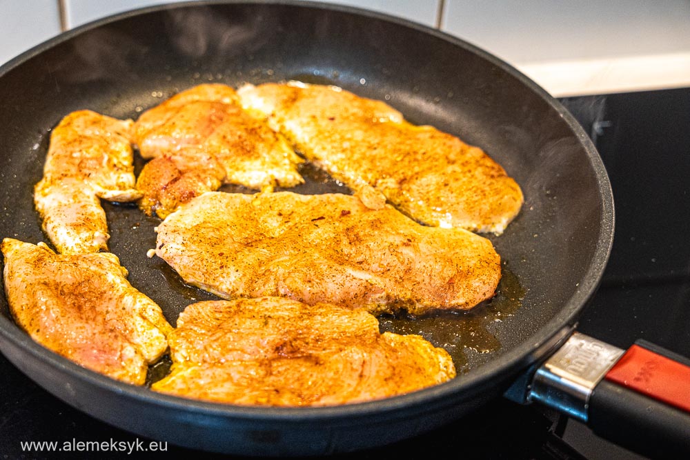 Na patelni rozgrzewam oliwę z oliwek. Kurczaka smażę na średnim ogniu około 4-5 minuty z każdej strony, aż mięso będzie ładnie zarumienione i dobrze usmażone w środku.