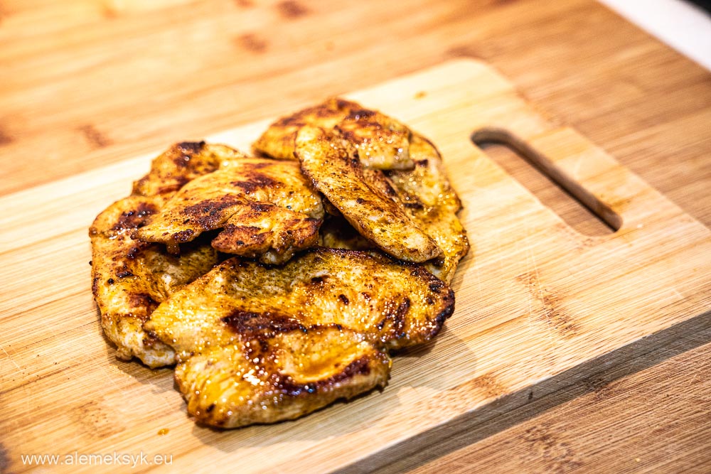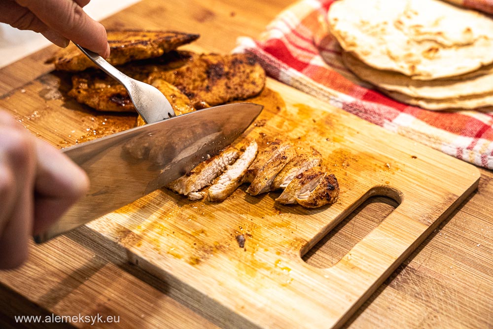 Po usmażeniu odkładam kurczaka na kilka minut, żeby odpoczął. Następnie kroję go w paski – tak będzie się najlepiej układał w tacos.