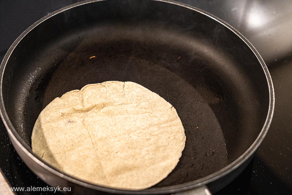 Tortille kukurydziane podgrzewam na suchej patelni przez kilkadziesiąt sekund z każdej strony. Powinny być ciepłe i elastyczne. Jeśli macie kuchenkę gazową, możecie je lekko opalić nad płomieniem – wtedy nabierają fajnego aromatu.