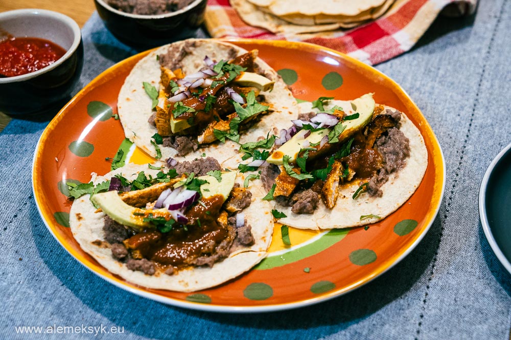 Na każdą tortillę nakładam warstwę ciepłych frijoles refritos – to świetna baza i dodaje kremowej konsystencji. Następnie dodaję kawałki grillowanego kurczaka, pokrojoną w kostkę czerwoną cebulę, świeżą kolendrę, salsę pomidorową, odrobinę salsy chipotle dla lekkiej ostrości. Na koniec całość skrapiam sokiem z limonki i gotowe.