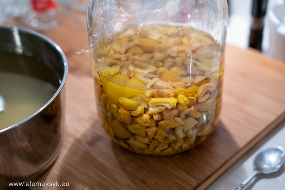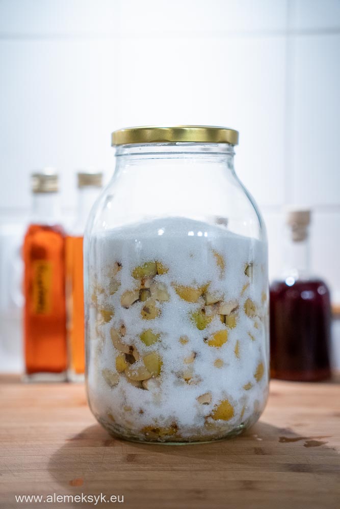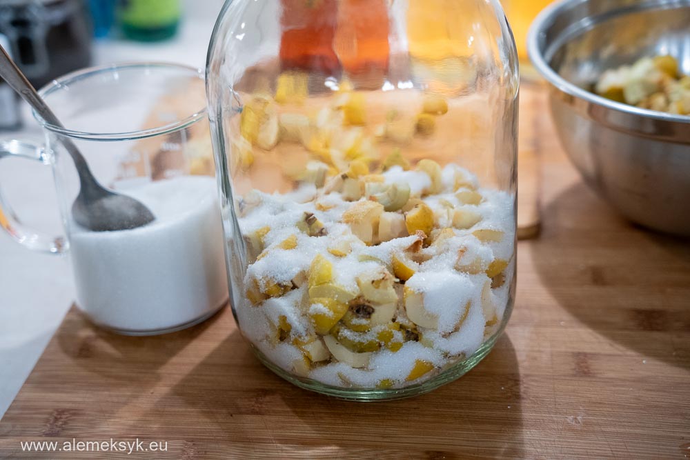 Warstwowanie – W dużym szklanym słoju ułóż warstwę pigwowca, następnie posyp ją łyżką cukru. Powtarzaj warstwy, aż skończą się owoce i cukier. Zakręć słój i odstaw w ciepłe miejsce (20-23°C) na 3-5 dni.