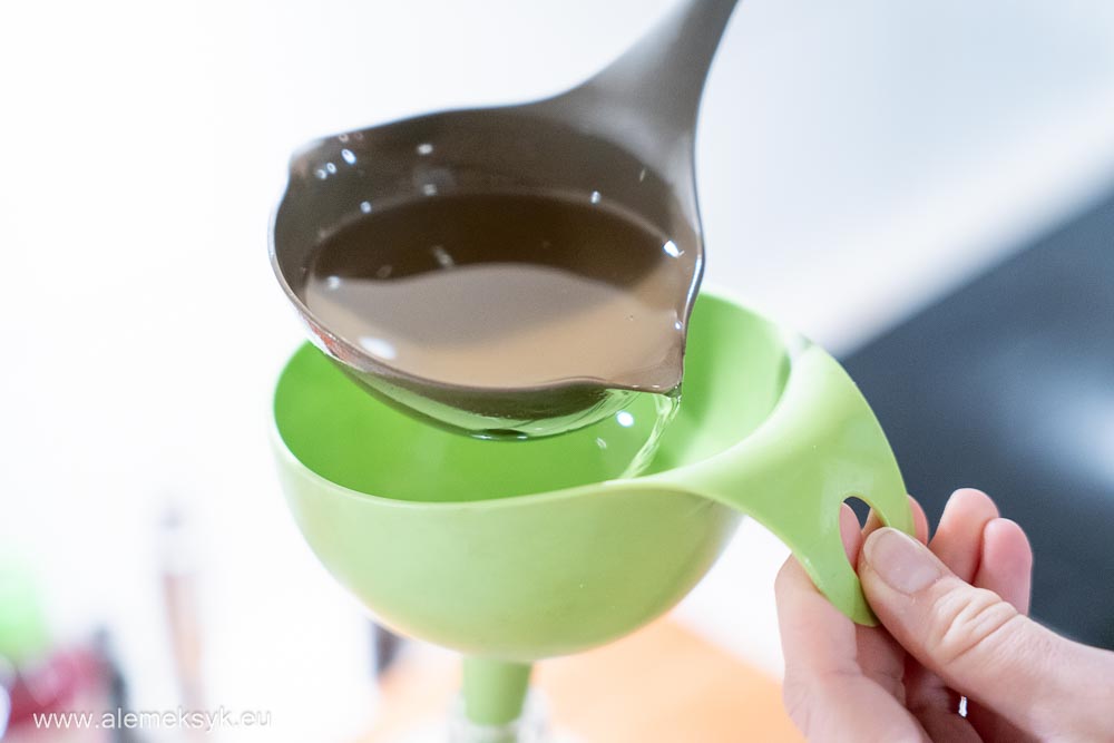 Po tym czasie nalewkę warto przecedzić aby pozbyć się powstałego osadu. Ja wykorzystuje do tego zwykłego lejka i filtru do kawy. Użycie filtra do kawy skutkuje tym, że nalewka robi się klarowna i nie ma żadnych „przeszkadzajek” 😊 Ten krok może trwać kilka godzin, ale daje perfekcyjną klarowność.