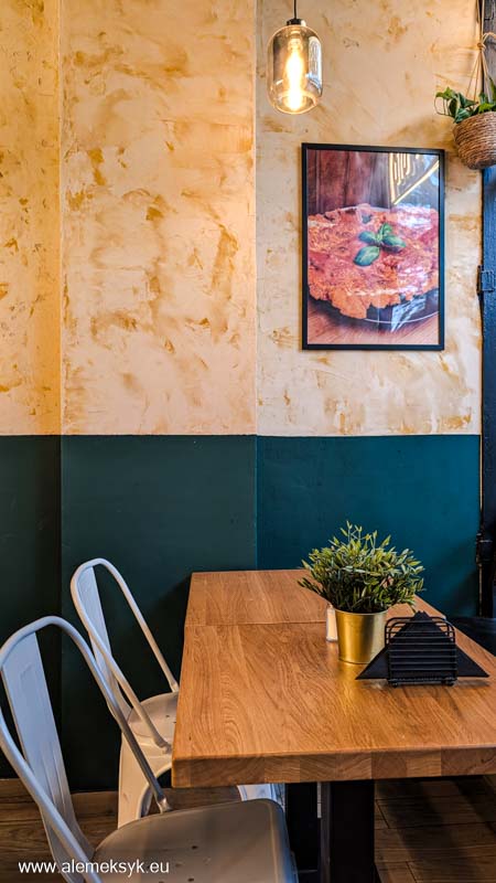 Układ lokalu to jedna otwarta przestrzeń – dzięki temu nikt nie czuje się odseparowany, a jednocześnie łatwo tu o kameralność. Stoliki są ustawione w taki sposób, że można wpaść na szybki obiad solo, ale też bez problemu zorganizować spotkanie większą grupą znajomych – stoły łatwo łączyć w dłuższe ustawienia.