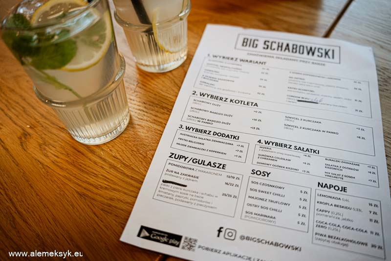 Karta dań w Big Schabowski jest krótka, ale bardzo przemyślana. Tutaj nikt nie próbuje udawać, że schabowy jest tylko dodatkiem. To on jest bohaterem – duży, soczysty i w kilku odsłonach.