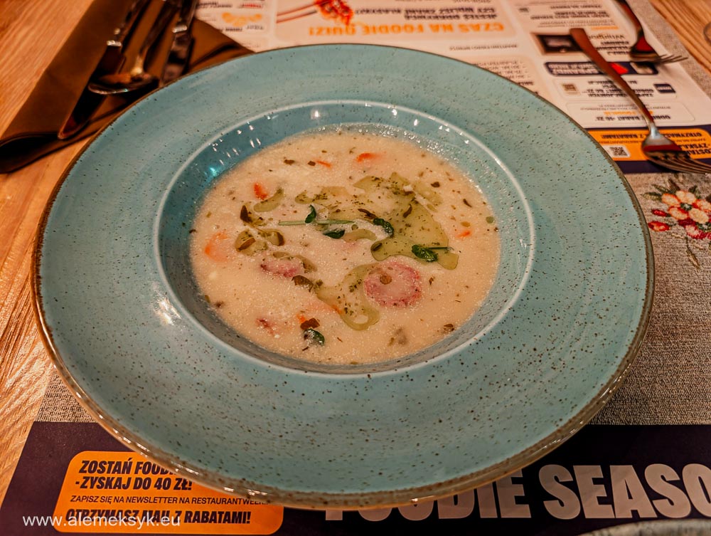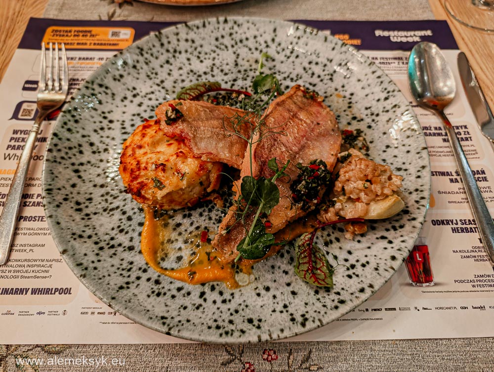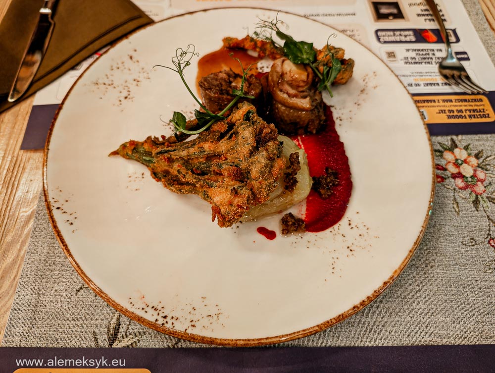 Zaczęło się od kremowego białego barszczu na maślance z białą kiełbasą, marchewką i przepiórczym jajkiem. I powiem tak – bardzo dobry start. Barszcz był kremowy, lekko kwaśny, dobrze zbalansowany. Nie była to „lekka zupka”, tylko konkretna przystawka, która od razu daje sygnał, że kuchnia wie, co robi.