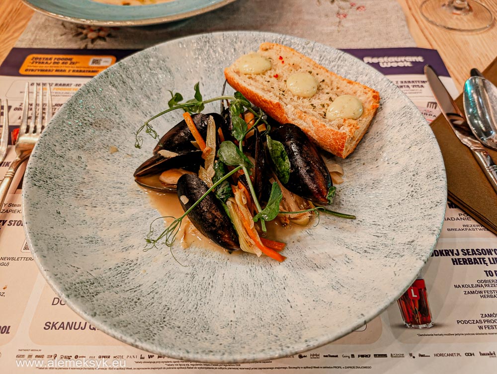 Na początek mule z korzennymi warzywami w sosie cydrowo-maślanym z parmezanem, grzanką czosnkową i majonezem lubczykowym. Bardziej fine diningowo, bardziej „restauracyjnie”. Sos robi robotę – lekko słodkawy od cydru, maślany, dobrze podkręca smak muli.