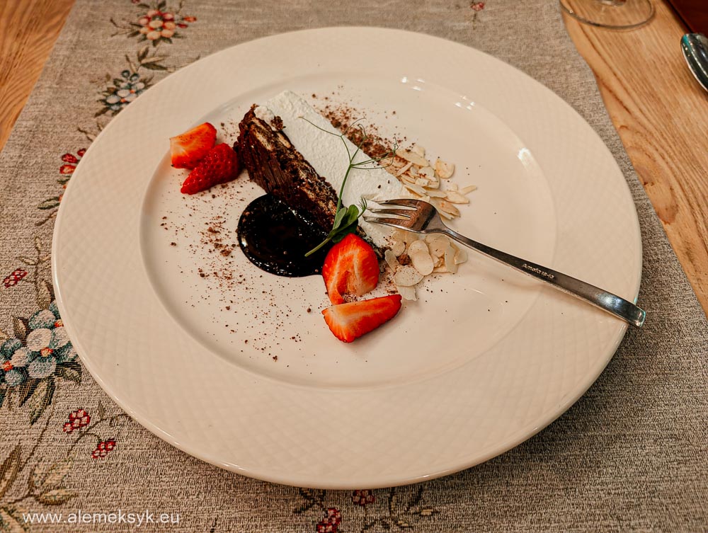 Na deser sernik portugalski z owocami sezonowymi i sosem czekoladowym. Lekki, kremowy, mniej ciężki niż klasyczny sernik. Bardzo dobry wybór po tak konkretnym daniu głównym.